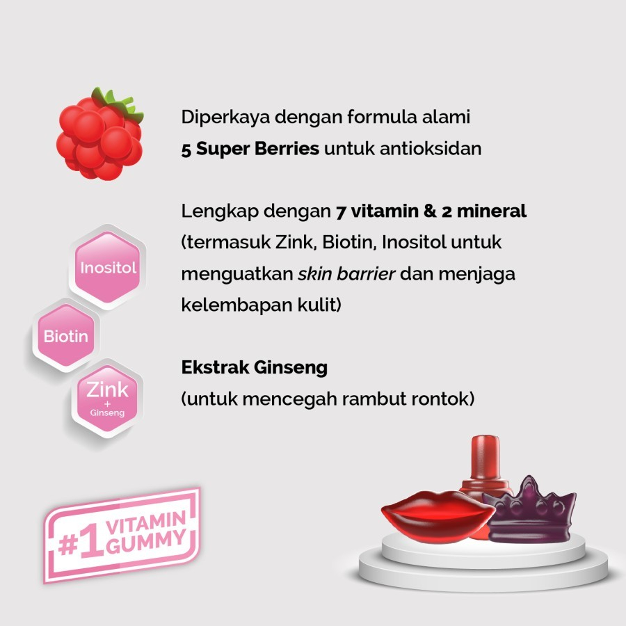 Hadir dengan 3 bentuk gummy yang lucu dan rasa yang bervariasi yakni lipstik, bibir dan mahkota.