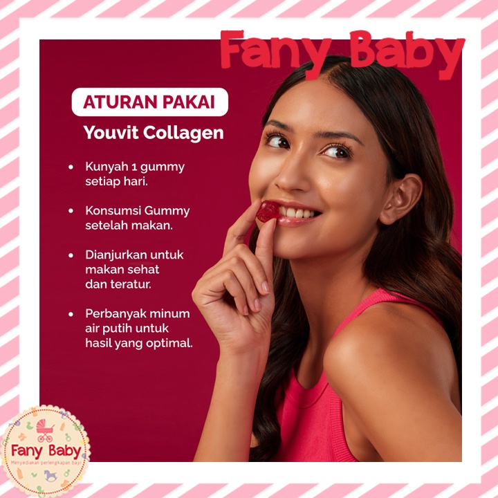 Youvit Collagen formula TERBARU merupakan perpaduan suplemen collagen, vitamin C, Superberries, Acai dan Pomegranate dalam format gummy (jelly kunyah) kualitas premium karena Collagen yang digunakan adalah High-Quality VERISOL®️ Bioactive Collagen Peptides®️ (bukan kolagen ikan atau marine). Kombinasi Collagen Peptides®️ dari VERISOL®️ (Collagen Sapi), Vitamin C dan berbagai antioksidan berfungsi untuk mencegah penuaan dini (untuk usia 16 tahun ke atas): - 1000 mg Collagen Sapi (per 2 gummy) - Kaya akan Vitamin C - Kaya akan antioksidan dari Strawberry, Raspberry, Blueberry, Acai dan Pomegranate - Berbentuk mawar yang unik dan strawberry - Diformulasikan bersama dermatologis untuk kebutuhan kulit orang Indonesia