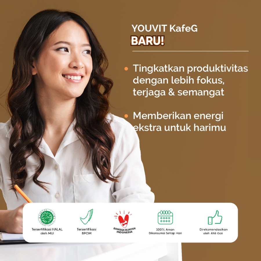Produk energy booster inovatif dalam bentuk gummy pertama di Indonesia yang pasti kamu butuhkan saat kamu sedang lelah atau ngantuk. Youvit Kafe-G diformulasikan khusus untuk kamu dengan segala kebaikan alam. Inovasi “Caffe-nergy” gummy ini mengandung: - 6 vitamin B: Vitamin B3, B5, B7, B6, B9, B12 yang berfungsi untuk membantu metabolisme energi - Ekstrak biji kopi pilihan, dengan kafein alami yang tinggi dan memberikan ekstra energi untuk gaya hidup aktif kamu - 1 Gummy setara dengan 1/3 cup kopi sehingga sangat aman untuk lambung dan dapat dikonsumsi oleh penderita masalah lambung.