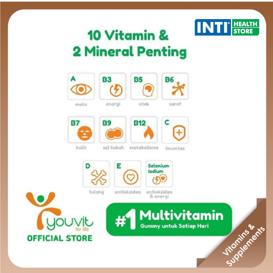 YOUVIT adalah multivitamin lengkap dengan kandungan 10 vitamin dan 2 mineral yang dibuat dari gummy sehingga mudah untuk dikonsumsi. Tinggal dikunyah dan tidak butuh air untuk menelannya.