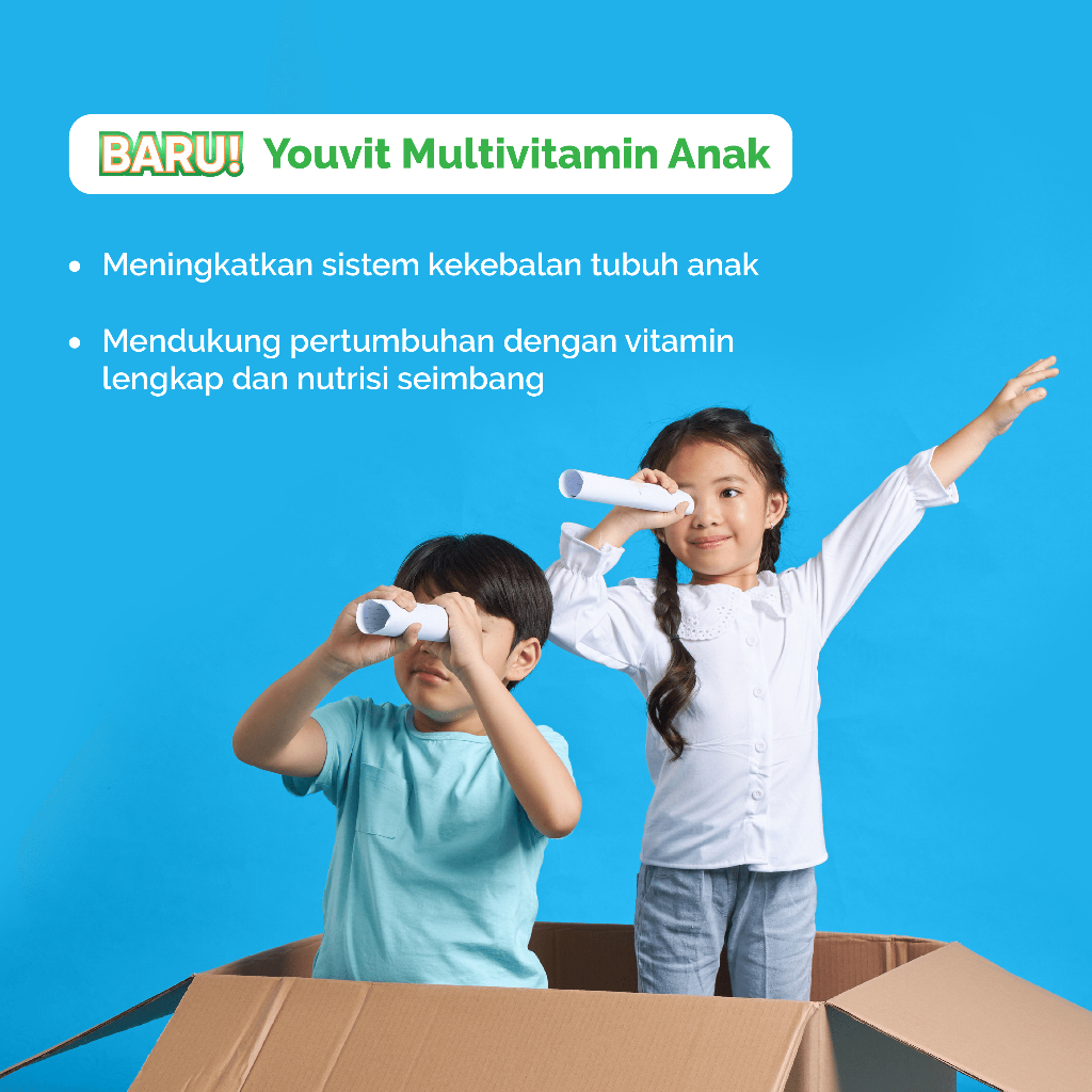 Youvit Multivitamin Gummy dengan Vitamin C, D, Zink, Sayur, Buah & Curcuma adalah formula baru dengan 12 Buah & Sayur serta Curcuma untuk dukung tumbuh kembang dan meningkatkan nafsu makan. Kaya vitamin C,D, Zink nya membantu menjaga daya tahan tubuh anak Anda agar tetap sehat dan tetap aktif (untuk usia 3-12 tahun). Manfaat : Menjaga imunitas anak Dukung tumbuh kembang anak Meningkatkan nafsu makan anak Bantu anak untuk tetap aktif Keunggulan : Nutrisi seimbang sesuai Angka Kecukupan Gizi (AKG) Menggunakan pewarna alami dari Hibiscus, Wortel dan Blackberry Menggunakan gula alami dari Stevia, serta rendah gula (2 gram per sajian) Aman dikonsumsi setiap hari Bentuk gummy yang menyenangkan dan mudah untuk dikonsumsi Kemasan higienis dan mudah untuk dibawa kemana-mana *Hadir dengan 3 monster yang lucu dan rasa berbeda: strawberry, jeruk dan nanas. Cara Pakai : Konsumsi 1 gummies perhari Perhatian : Tanpa pewarna sintesis Diproduksi menggunakan peralatan yang juga memproses susu, gandum, dan kedelai Konsumsi berlebihan mempunyai efek laksatif Simpanlah di tempat yang sejuk dan kering dengan temperature di bawah 30℃ Jangan dikonsumsi apabila segel kemasan dalam rusak