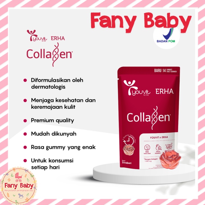 YOUVIT Erha Collagen merupakan perpaduan suplemen collagen dan vitamin C dalam format gummy (jelly kunyah) kualitas premium.