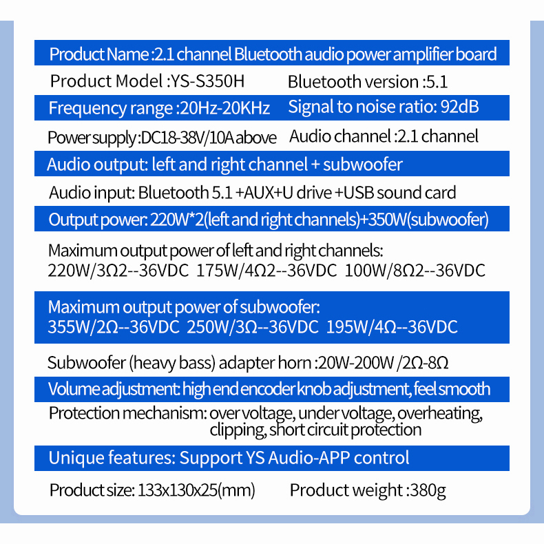 Parameter produk 130mm 25mm 133mm Nama Produk: Papan penguat daya audio Bluetooth 2.1 saluran Model Produk: YS-S350H Versi bluetooth :5.1 Rentang frekuensi: 20Hz-20KHz Rasio sinyal terhadap kebisingan: 92dB Catu daya: DC18-38V/10A di atas saluran audio: saluran 2.1 Keluaran audio: saluran kiri dan kanan + subwoofer Input audio: Bluetooth +AUX+U drive + kartu suara USB Daya keluaran: 220W * 2 (saluran kiri dan kanan) + 350W (subwoofer) Daya keluaran maksimum saluran kiri dan kanan: 220W/3Q2--36VDC 175W/4Q2--36VDC 100W/822--36VDC Daya keluaran maksimum subwoofer: 355W/2Q2--36VDC 250W/3Q--36VDC 195W/4Q2--36VDC Klakson adaptor subwoofer (bas berat): 20W-200W /202-80 Penyesuaian volume: penyesuaian kenop enkoder kelas atas, terasa halus Mekanisme proteksi: over voltage, under voltage, overheating, clipping, short circuit protection Fitur unik: Mendukung kontrol YS Audio-APP Ukuran produk: 133x130x25(mm) Berat produk: 380g