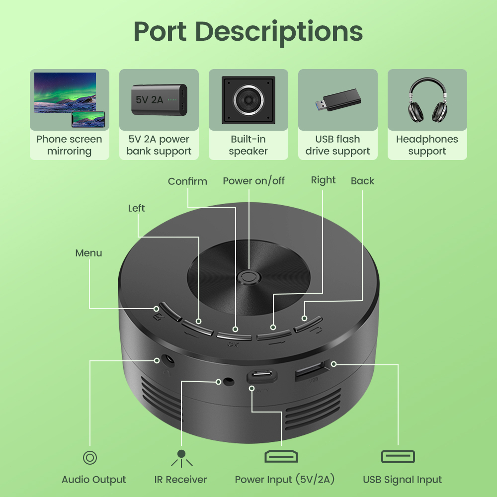 Fitur: 1. Pencerminan layar ponsel berkabel: mendukung ponsel/tablet iPhone/Android, sambungkan proyektor ke ponsel Anda dengan kabel USB, tidak perlu kabel adaptor ponsel tambahan. 2. Kalibrasi optik baru, lensa optik yang disesuaikan secara profesional, gambar di empat sudut layar terlihat jelas, tidak ada lagi tepi yang buram. 3. Desain kreatif, ukuran telapak tangan, kombinasi sempurna antara mode dan seni, YT200 mengadopsi plastik ABS yang ramah lingkungan, tidak berbau aneh, mencegah polusi industri dan melindungi kesehatan Anda dan keluarga. 4. Dapat diberi daya oleh pengisi daya dinding atau bank daya (output ≥5V / 2A). 5. Speaker internal; dengan jack output AUX 3.5mm untuk speaker / headphone eksternal. 6. Proyektor berkemah di luar ruangan, menonton film kapan saja, di mana saja.