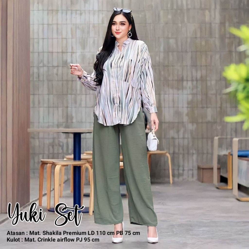 Detail Yuki Set - One Set Wanita Shakila Twill Premium Setelan Baju Setelan Celana Semi Kulot Kekinian OOTD