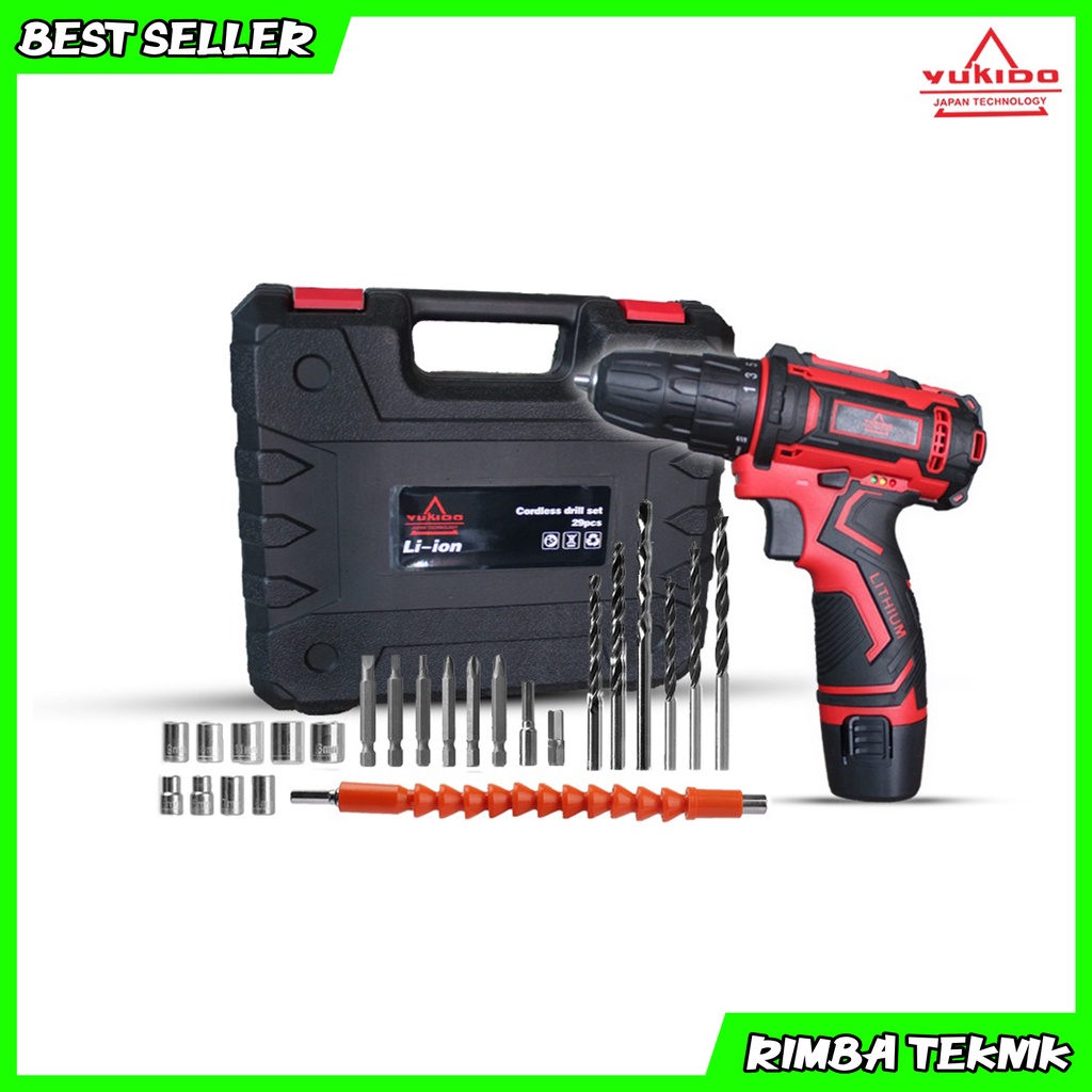 YUKIDO CORDLESS DRILL 12 VOLT mesin bor cordless baterai set plus mata