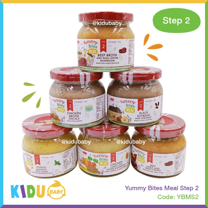 Yummy Bites Meal - Step 2 untuk 8 bulan ke atas terdiri dari : - Yummy Bites Meal Chicken Broth and Rice (Alergen: Susu) - Yummy Bites Black Soy Bean and Chestnut (Alergen: Kacang dan kedelai) - Yummy Bites Beef Broth and King Oyster Mushroom (Bebas Alergen) - Yummy Bites Meal Potato Risotto With Cheese - Yummy Bites Meal Chicken, Carrot & Oyster Mushroom - Yummy Bites Meal Beef, Apple & Sweet Potato