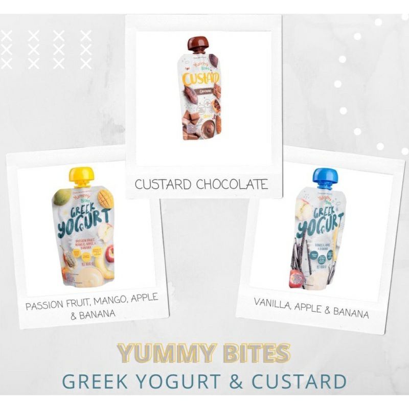 Yummy Bites Greek Yogurt Custard Chocolate, Passion Fruit Mango, Vanilla Apple Banana 100grYummy Bites Greek Yogurt Custard Chocolate, Passion Fruit Mango, Vanilla Apple Banana 100gr