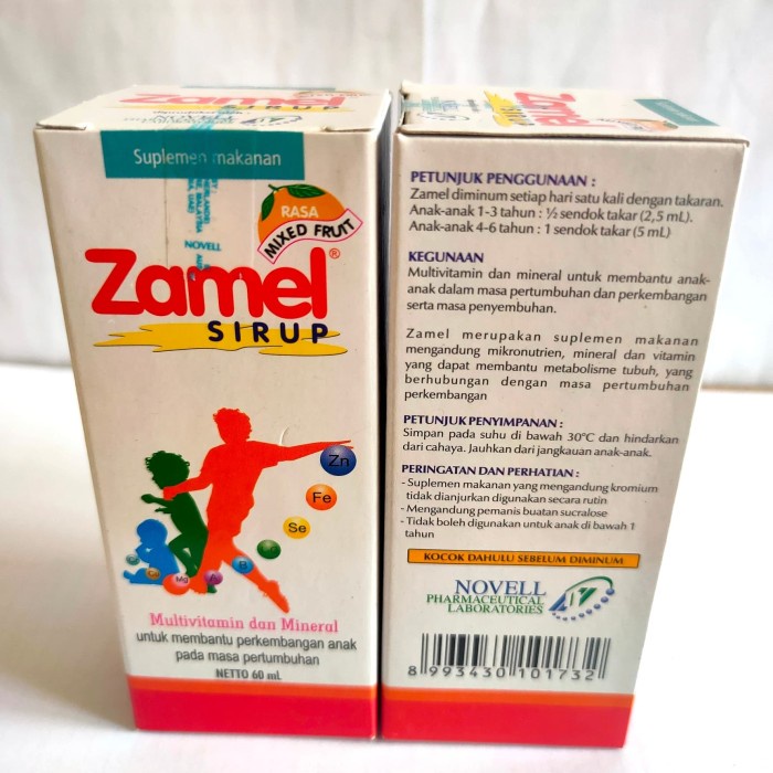 ZAMEL SIRUP merupakan suplemen makanan yang mengandung mikronutrium, mineral, dan vitamin yang digunakan untuk membantu metabolisme tubuh pada masa pertumbuhan dan perkembangan anak. Indikasi Umum Suplemen vitamin dan Mineral untuk anak-anak Komposisi