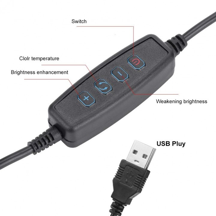 Technical Indicators Light Source: LED LED Number: 120pcs LED Outer Power: 8W CRI: Ra85 Lumens: 2600LM Output Voltage: USB 5V Color Temperature: 3200K - 5600K Dimmable: YES Material: Plastic Ring Light Size: External diameter 10-inch (26cm)/ Internal diameter 7.8-inch (20cm)