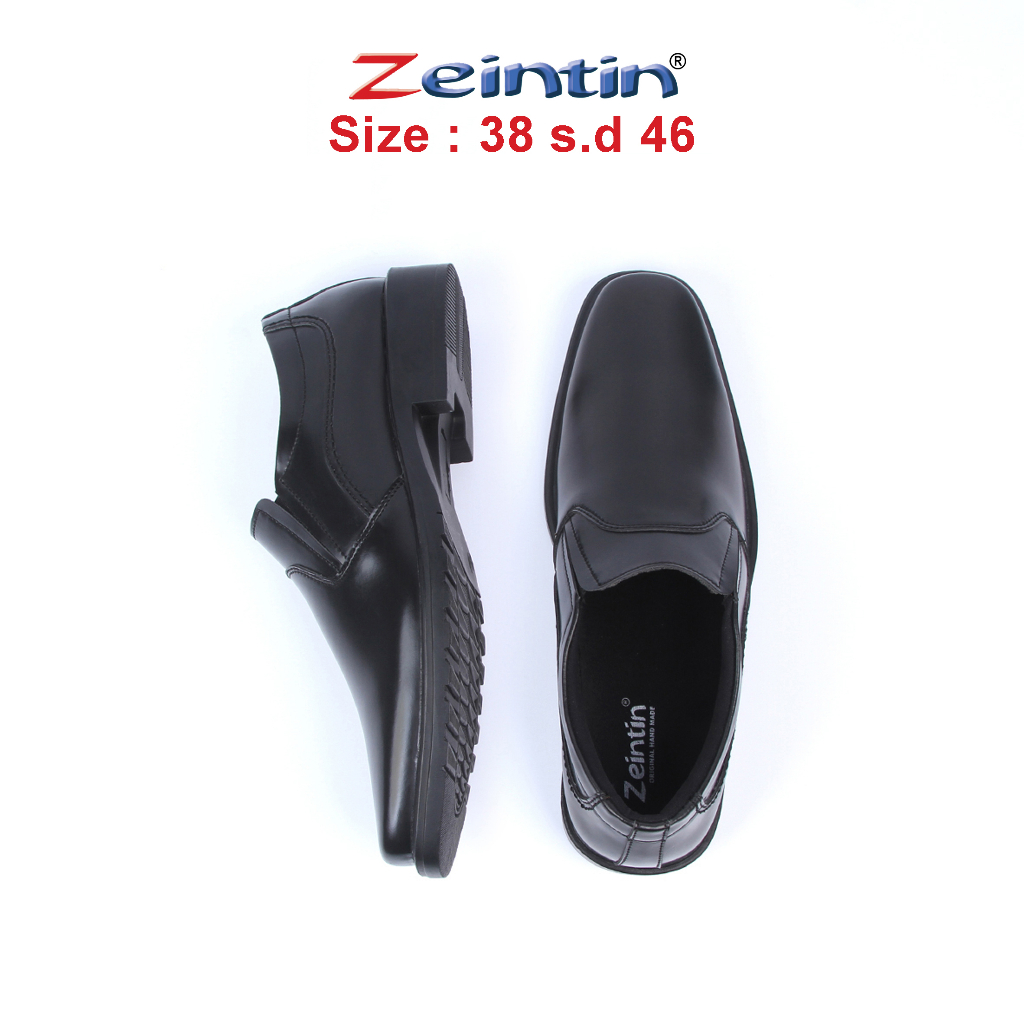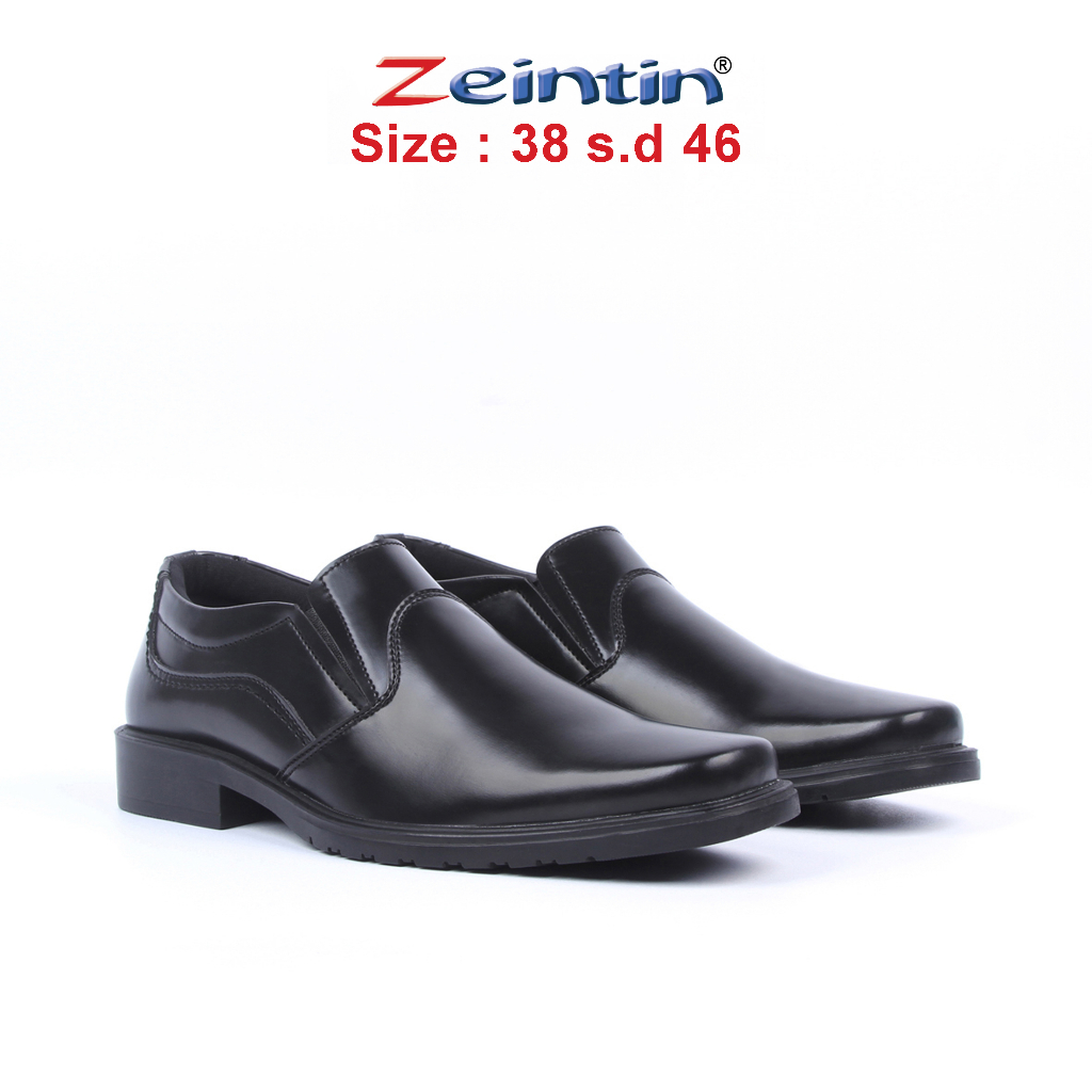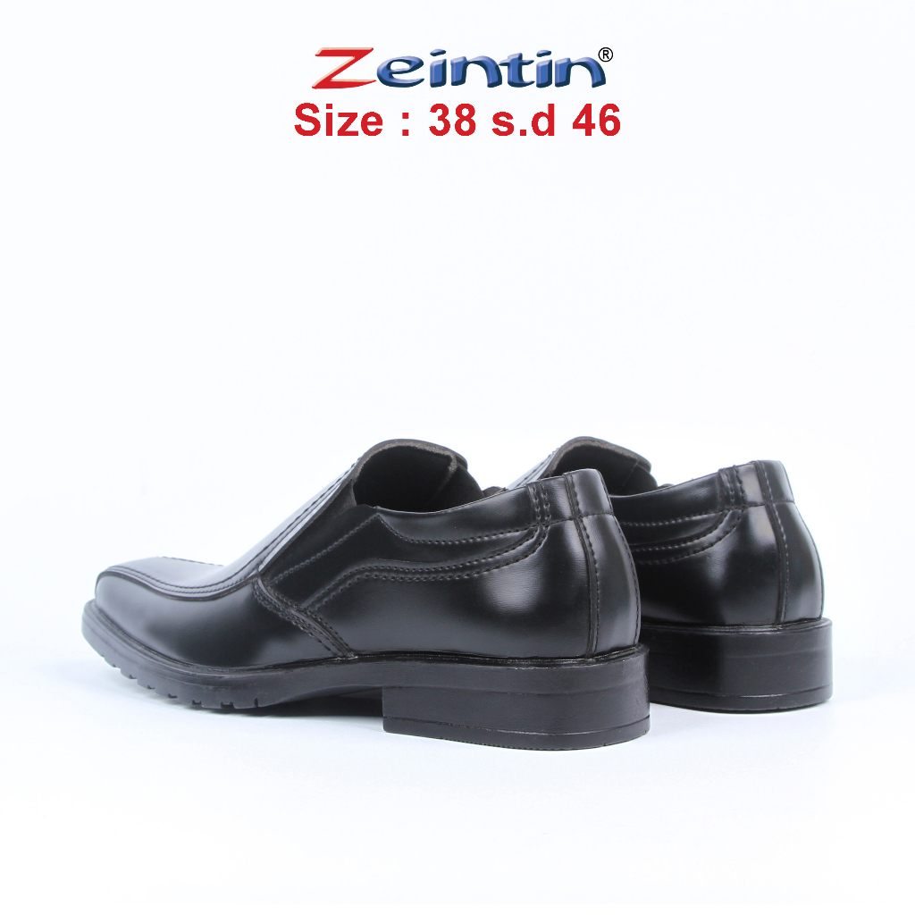 Merek : Zeintin Bahan Upper : PU leather ( Kulit Sintetis ) Jenis Sol : TPR ( Thermo Plastic Rubber ) Anti Licin Size : Tersedia 38 - 46 Warna : Full Hitam Size Chart :