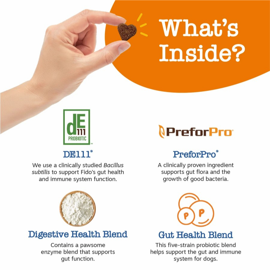 - MENAMPILKAN Prebiotik PreforPro - Setiap kunyahan mengandung 4mg PreforPro, yang merupakan Prebiotik hewan peliharaan premium yang terbukti secara klinis mendukung bakteri usus yang sehat dan pertumbuhan spesies Probiotik.
