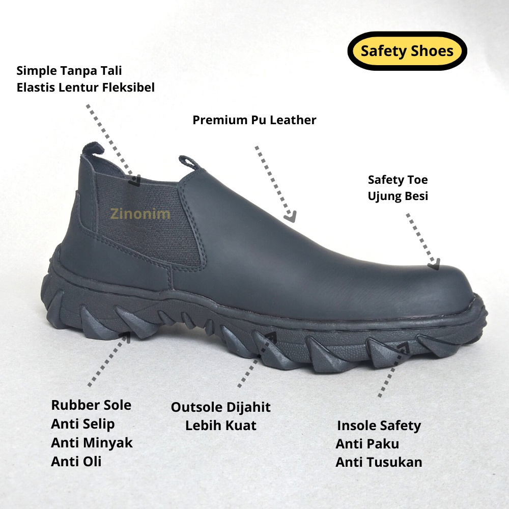 Zinonim Sepatu Safety Pria Slip On Elastik Ujung Besi Hitam Black Tanpa Tali Anti Paku Kerja Proyek Boots Safty Shoes