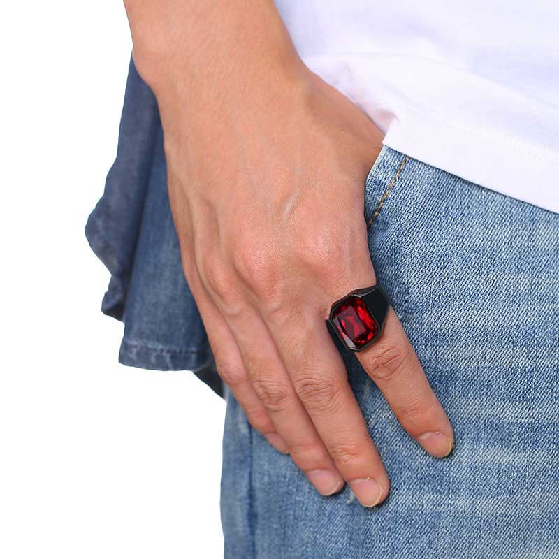 Detail Zirkon Ruby Sederhana Cincin Jari Batu Permata Dipoles Baja Titanium Hitam Perhiasan Fashion Pria Punk Pernikahan Rings