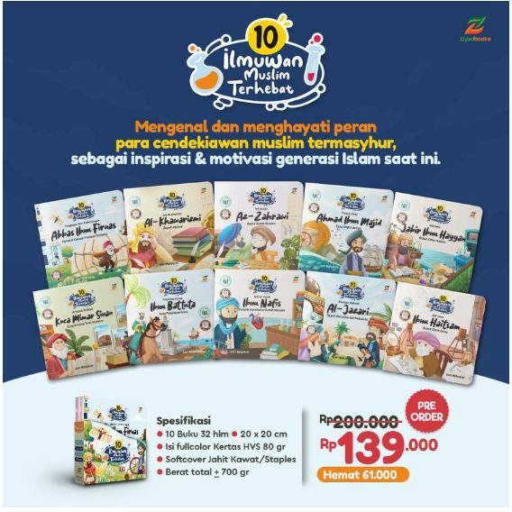 Buku ini menjadi produk yang masih banyak dicari. Terbukti telah habis terjual di PO tahap 1 dan 2. Merupakan salah satu produk best selling dari Ziyadbooks! Kini telah kami buka kembali Pre Order “10 ILMUWAN MUSLIM TERHEBAT”, paket buku yang mengulas kisah para ilmuwan Muslim hebat yang menginspirasi.