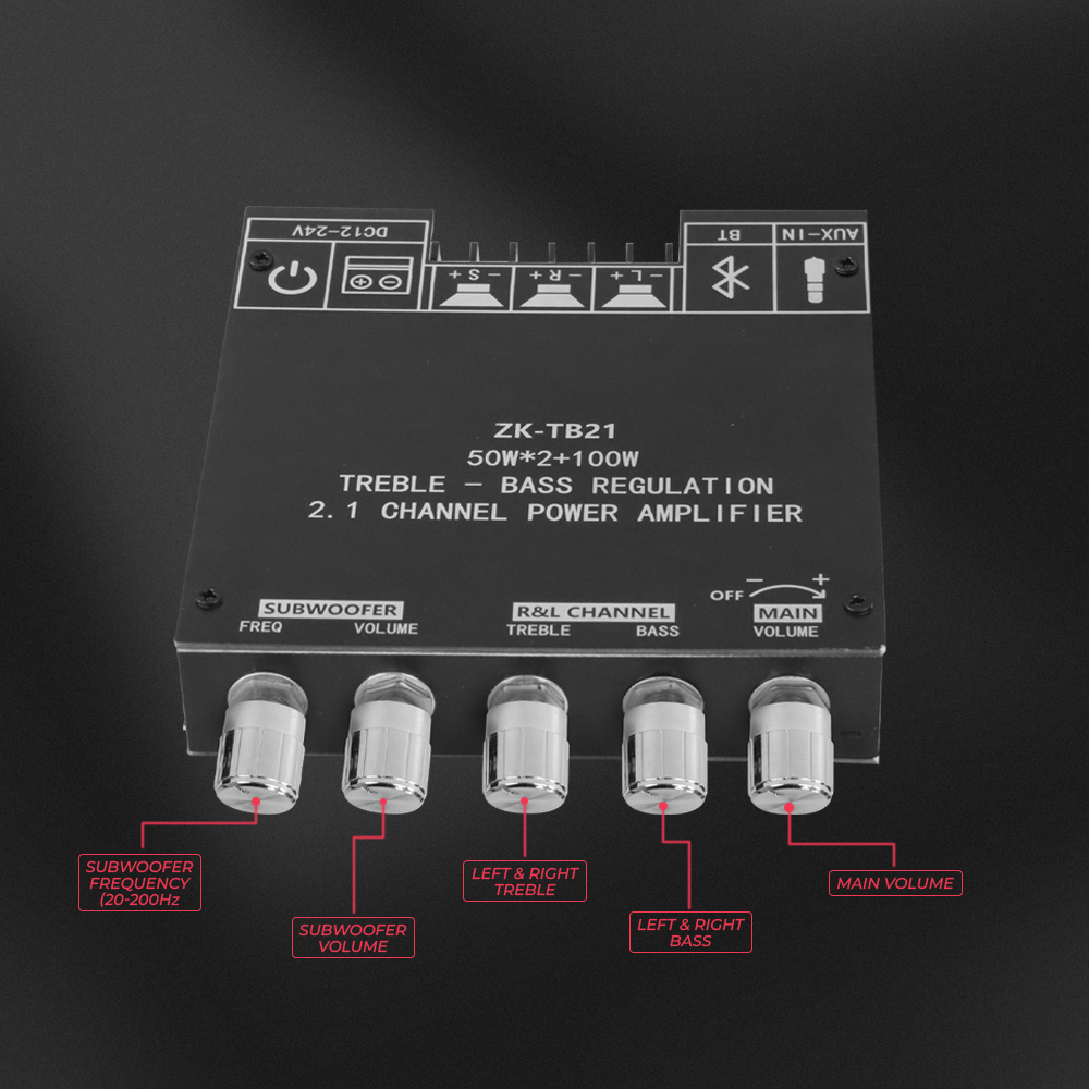 Kendali Audio Amplifier ini dilengkapi kendali suara seperti frekuensi subwoofer, treble, bass dan volume. Dengan kendali ini, Anda dapat menyesuaikan output suara speaker sesuai dengan selera telinga Anda.