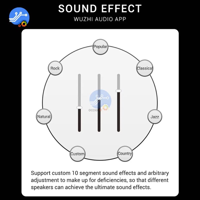 Model: ZK-LT21 Name: 2.0, 15WX2 Stereo Bluetooth Audio Power Amplifier Adapter power supply: 9-24V/3A (can not be connected to AC) Bluetooth version: 5.1 Audio input: BT+AUX+USB+USB sound card Audio output: left channel 15W + right channel 15W Volume adjustment: classic mechanical knob (with volume scale), stepless adjustment Switch machine: classic mechanical switch, one turn switch machine, no need to wait for a long time. Adapter speaker: 5-30W 4-8Ω Protection mechanism: overheating, overcurrent, short circuit, anti-static protection Product weight: net weight 40g, including packaging 76g Special feature Support Wuzhi Audio APP. Modify and change the bluetooth name, password setting, volume adjustment of prompt sound, on/off prompt sound, sleep aid, sound effect selection + custom sound effect, U disk playlist. Dimensions: 71*50*20mm