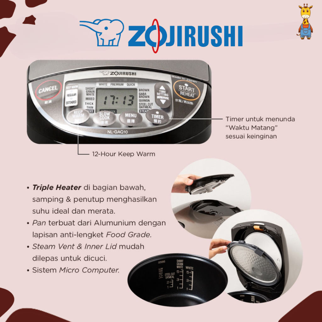 Deskripssi Produk : - Sistem Micro Computer - Tempat nasi terbuat dari Alumunium dengan lapisan anti lengket food grade - Keep Warm nasi 12 jam - 10 pilihan menu memasak 1. SHORT GRAIN (beras putih Jepang yang pendek2) 2. WHITE (nasi putih) 3. MIXED (nasi tim) 4. CONGEE (bubur) 5. BROWN ( nasi merah) 6. GABA BROWN (nasi merah yang ditingkatkan kandungan GABA-nya hingga 150 %, bagus untuk kesehatan jantung) 7. QUINOA 8. STEEL CUT OATMEAL 9. STEAM (kukus) 10. SLOW COOKER (cocok untuk memasak potongan daging kecil2 tanpa tulang) - TIMER untuk menunda waktu/jam matang nasi sesuai keinginan - Tutup bagian dalam mudah dilepas untuk dicuci setiap selesai digunakan - Bodi Stainless