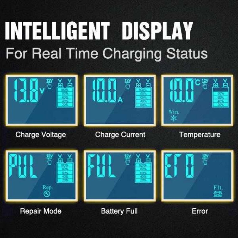 Informasi pada Layar Untuk memudahkan pemantauan, charger baterai aki ini telah dibekali dengan layar digital. Anda bisa melihat informasi mengenai tegangan, arus, suhu, mode, kerusakan, hingga status baterai pada layar tersebut.