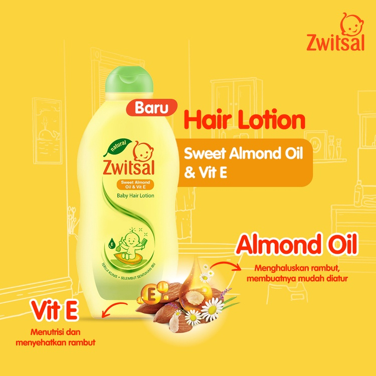 Baru Zwitsal Hair Lotion Sweet Almond Oil & Vit E! Dilengkapi dengan Sweet Almond Oil untuk menutrisi dan melindungi kelembapan kulit kepala dan rambut Si Kecil. Formula yang mengandung Vit E untuk menjaga rambut tetap sehat. Menjadikan rambut lebih mudah diatur dengan wangi lembut khas Zwitasl.