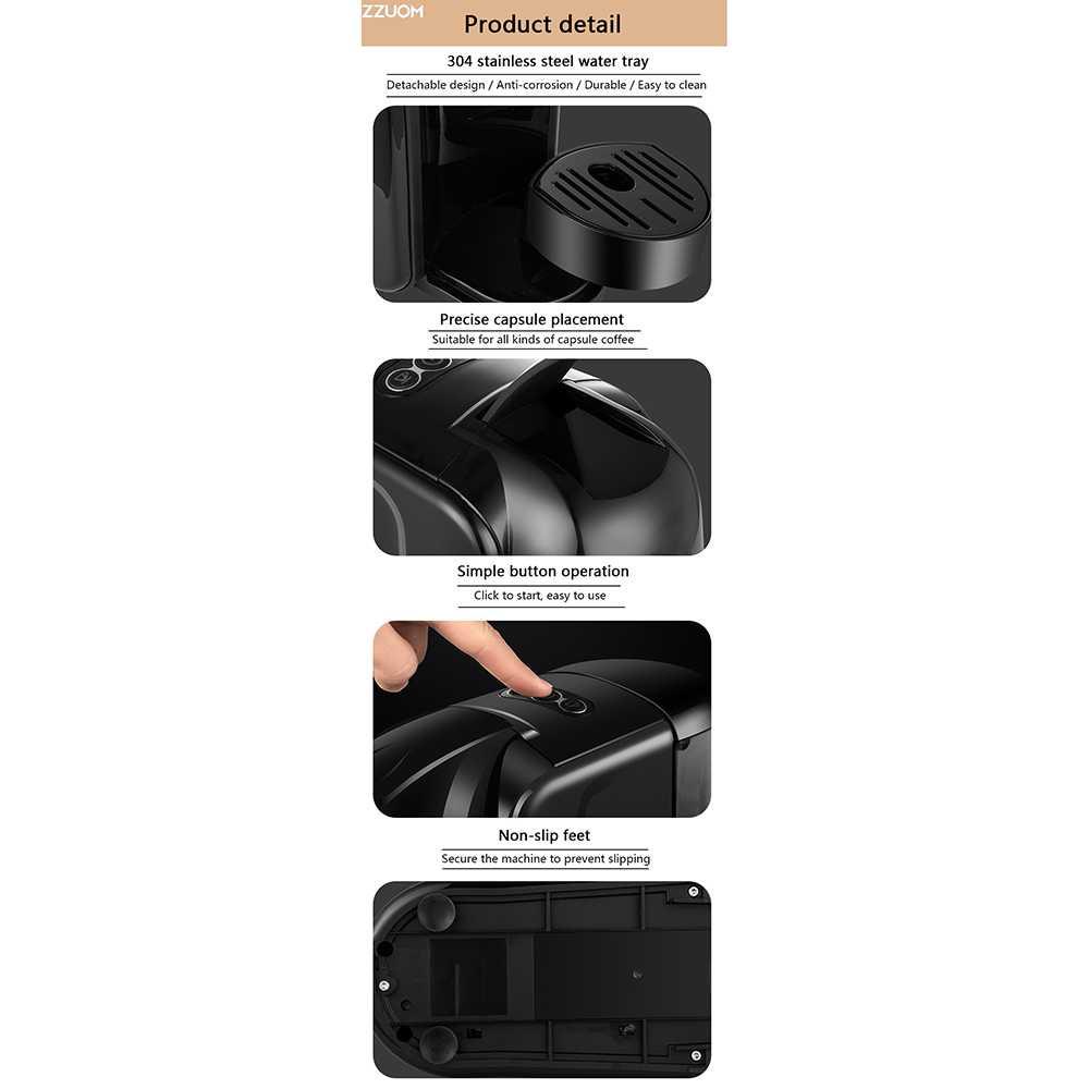 Spesifikasi ZZUOM Mesin Kopi 3in1 Capsule Espresso Nespresso Dolce Gusto - ST-511 Kapasitas Isi : 600 ml Voltase : AC 220-240 V 50/60 Hz EU Plug Daya / Power : 1450 W Material : Plastik, SUS304 Stainless Steel Dimensi : Dimensi Total: 110 x 270 x 250 mm