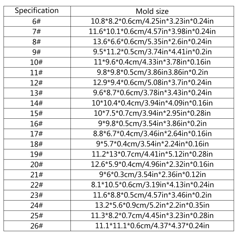 Spesifikasi: Bahan: Silikon Kelas Makanan Warna: seperti gambar Tipe1 F1406WS Tipe2 F1407WS Tipe3 F1408WS Tipe4 F1409WS Tipe5 F1410WS Tipe6 F1411WS Tipe7 F1412WS Tipe8 F1413WS Tipe9 F1414WS Tipe10 F1415WS Tipe11 F1416WS Tipe12 F1417WS Tipe13 F1418WS Tipe14 F1419WS Tipe15 F1420WS Tipe16 F1421WS Tipe17 F1422WS Tipe18 F1423WS Tipe19 F1424WS Tipe20 F1425WS Tipe21 F1426WS Ukuran: Seperti gambar