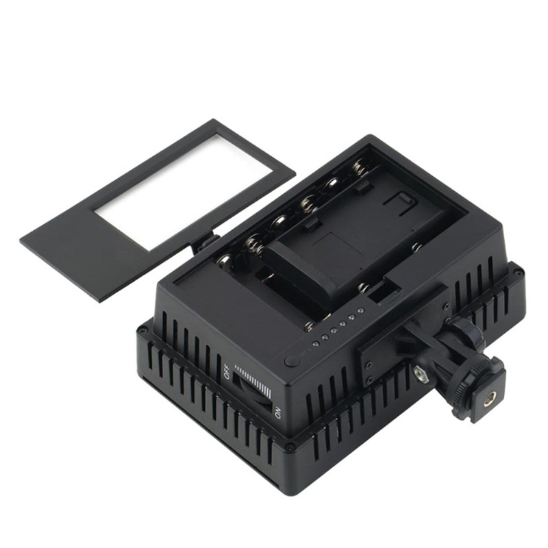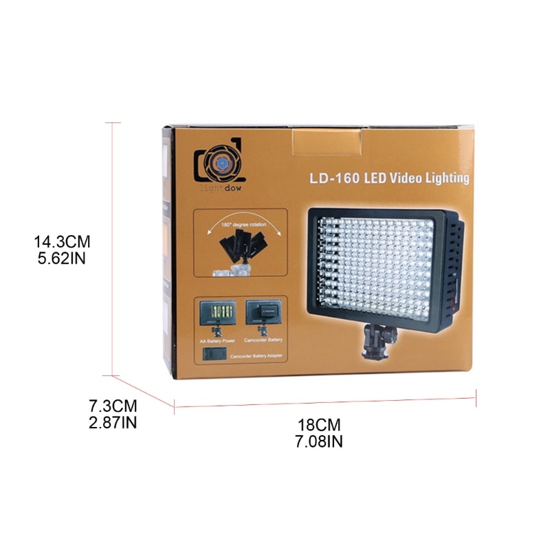 Spesifikasi: Model: LD-160 Warna: Hitam Bahan: PC + logam Ukuran: kira-kira. 18x7.3x14.3 cm/7.08x2.87x5.62in Perangkat yang kompatibel: Kamera, kamera digital portabel, sebagian besar digunakan untuk distribusi atau penambahan lampu kamera Cara yang dapat diredupkan: Dapat diredupkan tanpa polaritas' Led: 160 Durasi: 30.000 jam Suhu Warna: 5400K / 3200K Fluks bercahaya: 660LM (bekerja selama 2 jam) Tegangan masukan: DC7,2-8,4V Daya: 9.6W